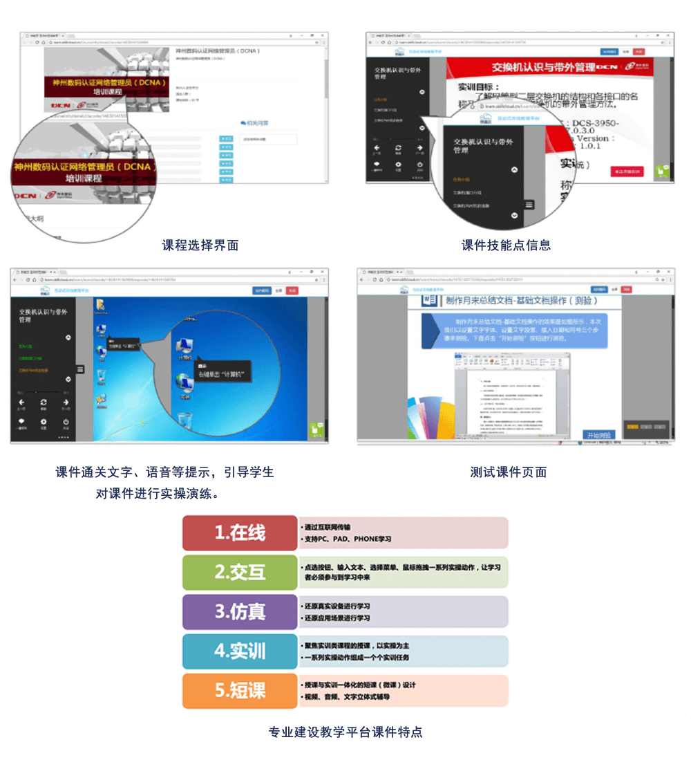 DCTP-50以先进的应用仿真技术开发多种岗位业务场景的仿真环境,以课件资源的形式搭载到实训云平台上。将多媒体技术和引导式仿真技术结合,改进课程教学模式,体现网路课程资源的广泛性、参与性与共享性,突出实训课程的互动实操性。 |